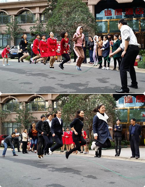 每支代表队共有8人(摇绳2人,跳绳6人)参赛,比赛时限3分钟,以跳跃成功次数多少排出名次。赛场上,只见参赛队员身轻如燕,上下跃动,随绳起舞。有时由于各队员动作不协调而使跳绳中断,但在队长的口令下,身心经过短暂调整后,又继续比赛,没有放弃;有的参赛队多次出现跳绳中断,但他们没有气馁,“我们的目标是30个!”通过这种设定目标个数的方式为自己打气,达到目标后,又不断调高目标为自己加压,“我们的目标是50个!”跳绳要讲究技巧,摇绳同样需要恰到好处的力道和技巧,但见有的参赛队的年长队员老当益壮,时而俯身摇绳,时而起身为跳绳队员加油打气。现场观众也是凝神屏气,数着跳绳个数,为参赛队员鼓劲助威,“……119,120,121!”现场欢呼雀跃,荆门逸居酒店一队以121个的绝对优势夺取冠军。