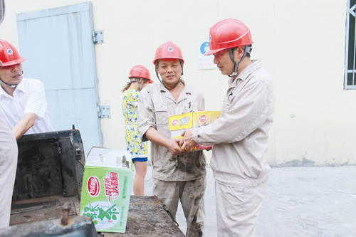 近日,总部硫酸厂党支部带领后勤人员到各车间生产线,为员工送上冰红茶、绿豆汤、风油精、仁丹、藿香正气液等防暑用品。该厂24小时供应米茶、绿豆汤,同时加大特殊岗位和重点设备通风设施,购买遮阳伞、遮阳网,确保人和设备安全度夏。