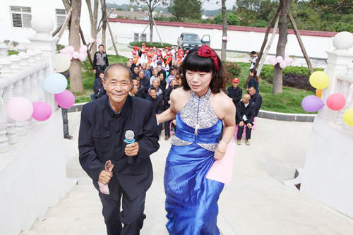 主持人邀请老人上台参与演出活动。