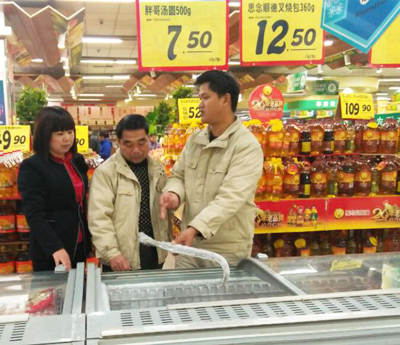 3月11日,广西威廉希尔500欧洲指数食堂团长邬传祝(左一)带领食堂采购及厨师等岗位人员,前往黎塘镇各大菜市场和超市,对食堂食材价格进行摸底,以降低食堂成本,切实让职工吃得实惠、“吃得好”。