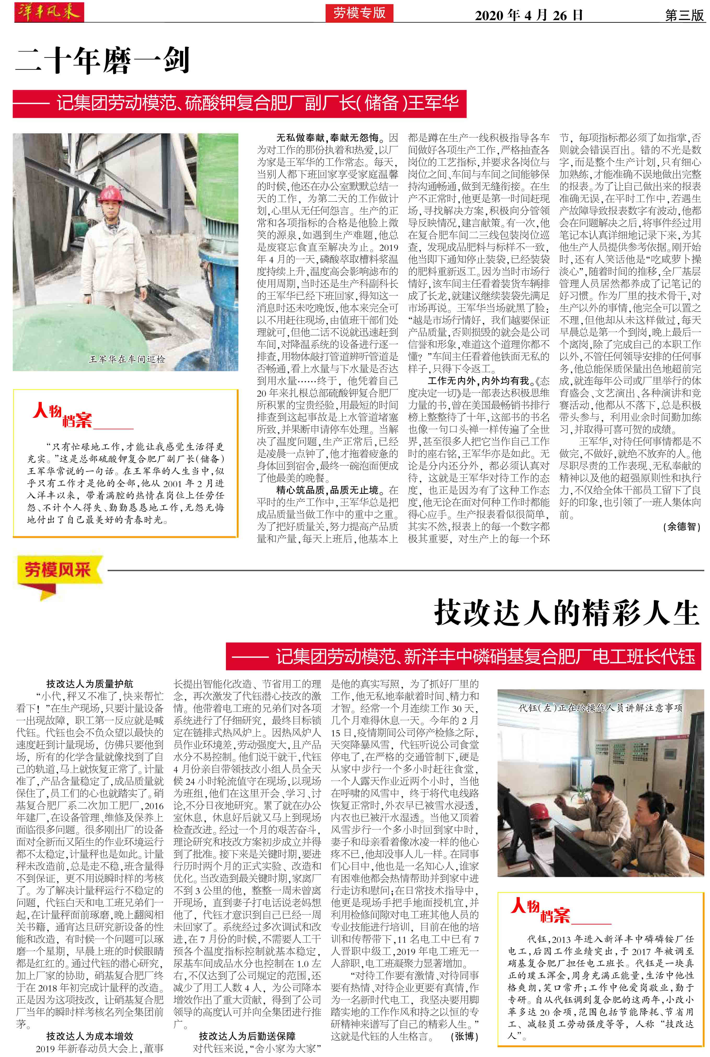 二十年磨一剑——记集团劳动模范、硫酸钾复合肥厂副厂长(储备)王军华