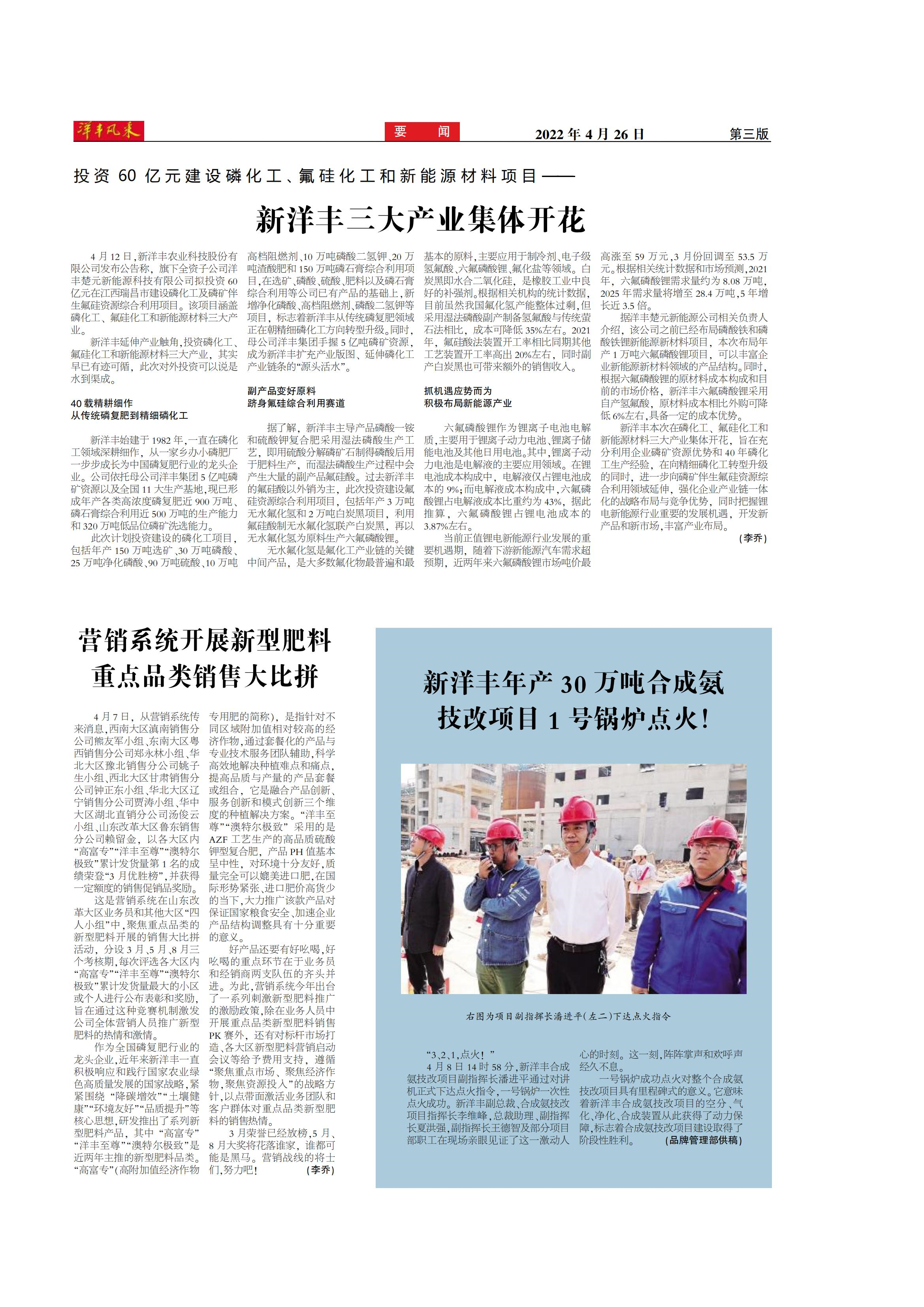 投资60亿元建设磷化工、氟硅化工和新能源材料项目——威廉希尔500欧洲指数三大产业集体开花