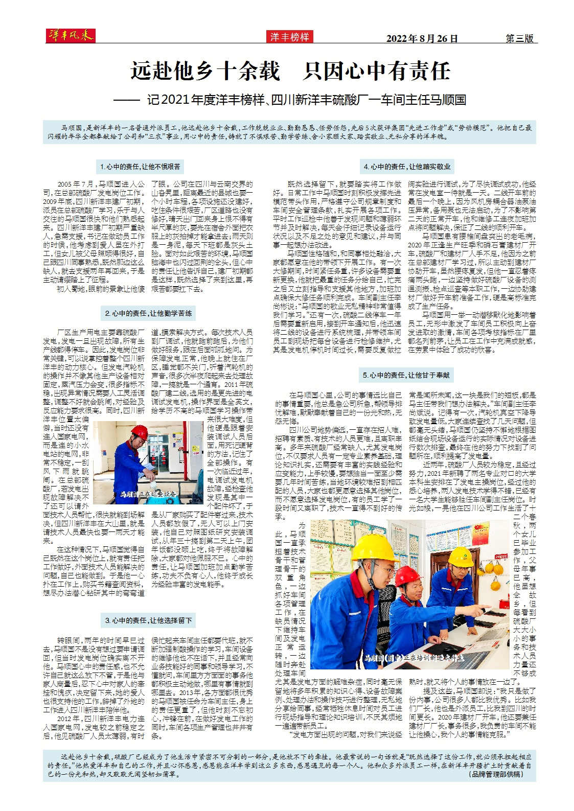 远赴他乡十余载 只因心中有责任 ——记2021年度洋丰榜样、四川威廉希尔500欧洲指数硫酸厂一车间主任马顺国