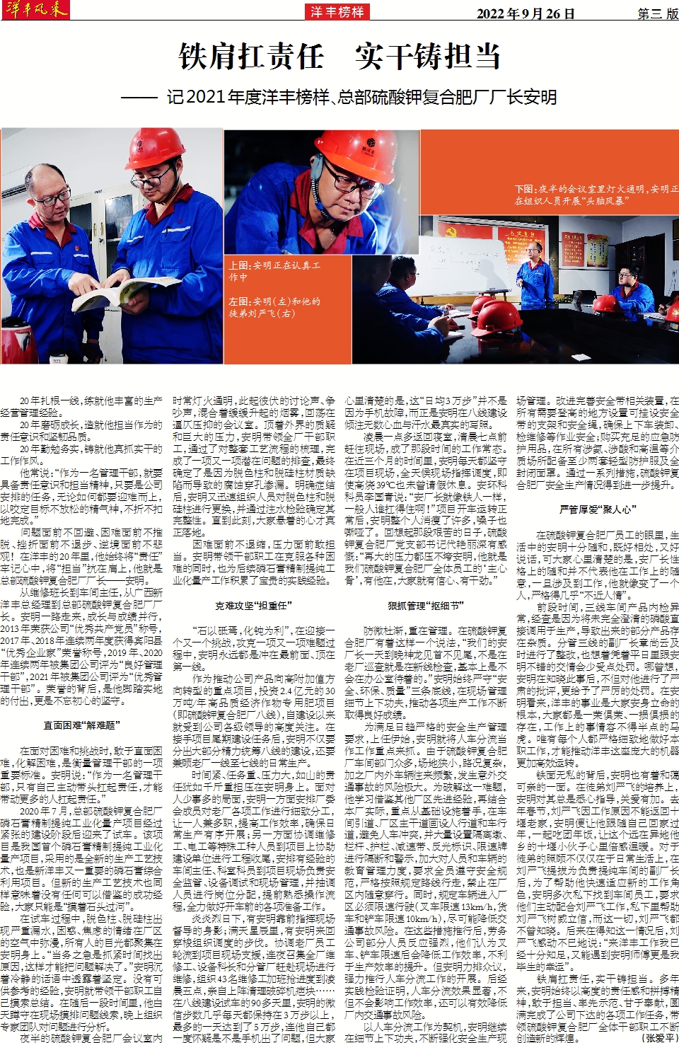 铁肩扛责任 实干铸担当 ——记2021年度洋丰榜样、总部硫酸钾复合肥厂厂长安明