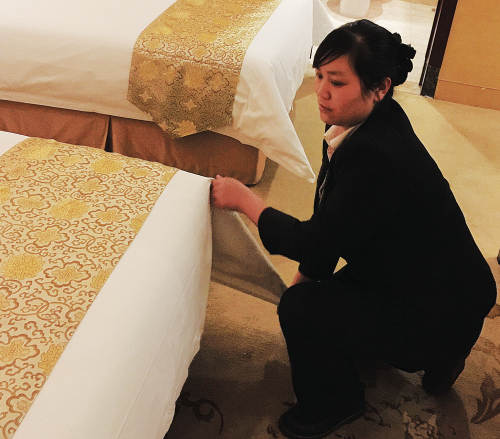 刘仁莲正在整理客房卫生