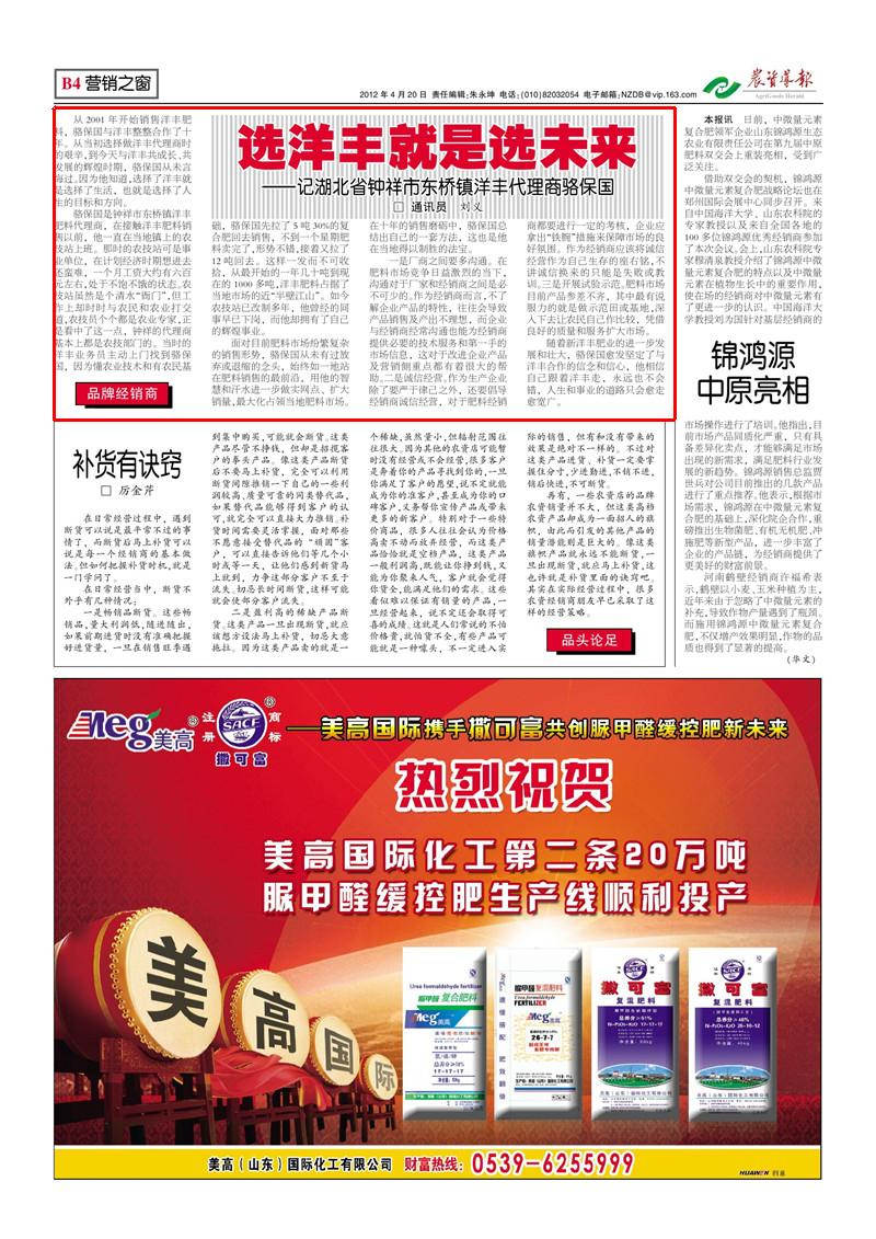 骆保国是钟祥市东桥镇洋丰肥料代理商,在接触洋丰肥料销售以前,他一直在当地镇上的农技站上班。那时的农技站可是事业单位,在计划经济时期想进去还蛮难,一个月工资大约有六百元左右,处于不饱不饿的状态。农技站虽然是个清水“衙门”,但工作上却时时与农民和农业打交道,农技员个个都是农业专家,正是看中了这一点,钟祥的代理商基本上都是农技部门的。当时的洋丰业务员主动上门找到骆保国, 因为懂农业技术和有农民基础, 骆保国先拉了5吨30%的复合肥回去销售,不到一个星期肥料卖完了,形势不错,接着又拉了12吨回去。这样一发而不可收拾,从最开始的一年几十吨到现在的1000多吨,洋丰肥料占据了当地市场的近“半壁江山”。如今农技站已改制多年,他曾经的同事早已下岗,而他却拥有了自己的辉煌事业。
