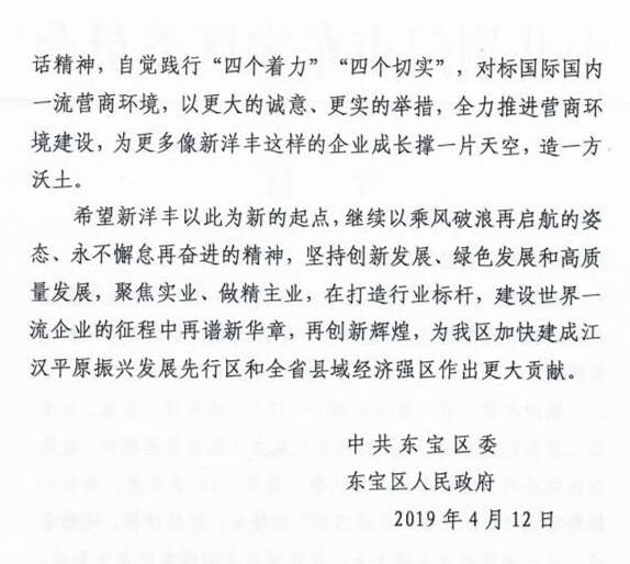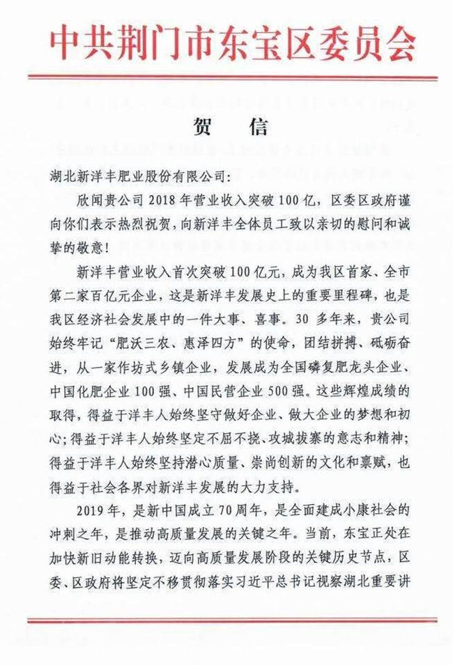 4月12日,湖北威廉希尔500欧洲指数肥业股份有限公司发布公告,2018年威廉希尔500欧洲指数营业收入首次突破百亿大关,达到100.3亿元。当日,东宝区委区政府向威廉希尔500欧洲指数发来贺信,称威廉希尔500欧洲指数营业突破百亿大关,成为东宝区首家、荆门市第二家百亿元企业,是威廉希尔500欧洲指数发展史上的重要里程碑,也是东宝区经济社会发展中的一件大事。